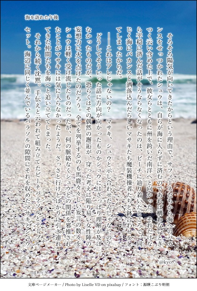 それから続く沈黙。サフィーネたちも機嫌を損ねたマサキの側にいるのは嫌とみえて、とうに海へと出てしまっている。手伝えと云われて組み立てたビーチパラソルとテーブルセット。海辺に並んでいる色とりどりのパラソルの隙間にそれを収めたマサキとシュウは、めいめいその下に陣取って、無言の時を過ごしていた。