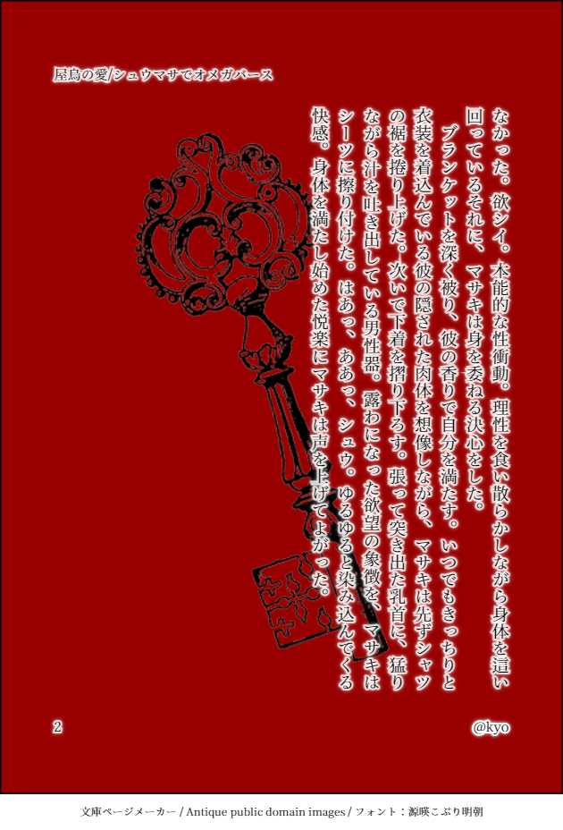 シュウマサでオメガバース(進捗報告その3) 頑張っております! 拍手有難うございます。心の支えとなっております。 最近仕事の環境が変わったのと、中々書く時間が捻出出来ないのとで、ストレスが溜まることが増えてきたんですけど、皆様のお陰で書き続けていられます。感謝しております。 (サムネイルクリックで原寸大表示になります) マーキング回。笑 あまりのエロ書きたさにやってしまいました。 今日は帰って来たらエロを書くんだー。楽しみだなぁ。笑 . PR コメント