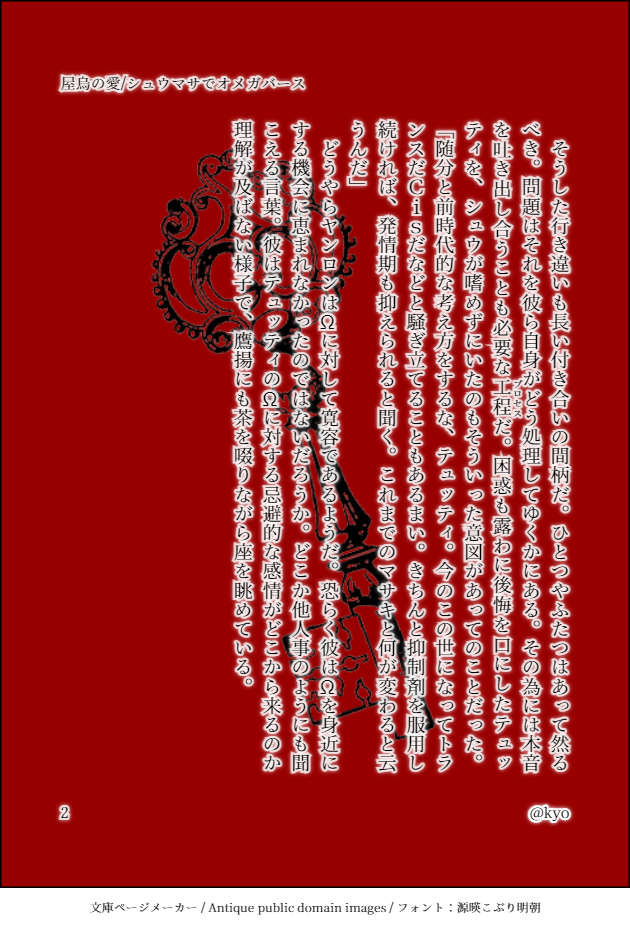 色んなオメガバースの設定をてんこ盛りにした上で、独自解釈だの設定だのを盛り込んでいるので、もしかすると読む方は疲れる作品になっているかも知れませんが、いつものことだよね!で押し切りることにした所存。笑
