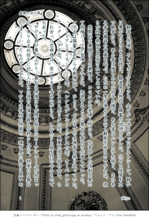 悲劇的な幕開けとは裏腹に、コミカルな登場人物たち。狂言回しの役割を果たす妖精パックが登場してからは、加速するように舞台の面白さが増していった。マサキは興奮冷めやらぬ劇場内で、ひとり。それまでの名場面を振り返っていた。