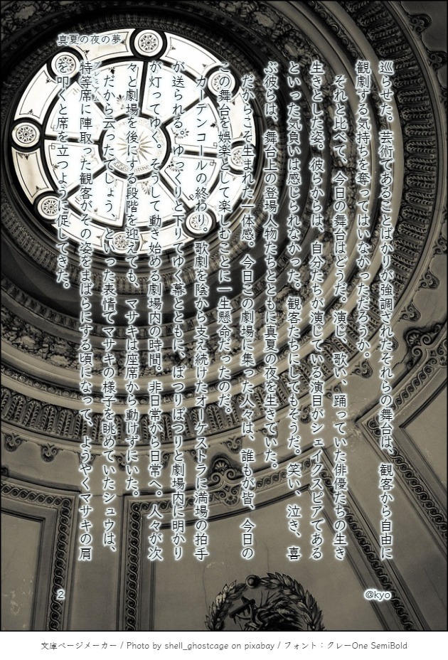 やがて再び幕が上がり、舞台に俳優たちが顔を揃えたカーテンコールが始まった。鳴り止まぬ拍手に迎え入れらた彼の表情は誰もが誇らしげだ。娯楽たる舞台とはこういったものであるのだ。マサキは学校の授業の一環で見た舞台に思いを巡らせた。芸術であることばかりが強調されたそれらの舞台は、観客から自由に観劇する気持ちを奪ってはいなかっただろうか。
