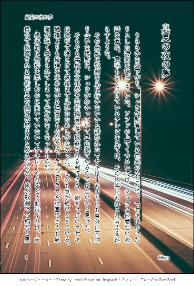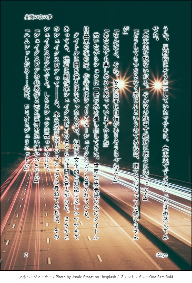 云いながらシュウは一冊の本を差し出してきた。重厚な皮表紙の本のタイトルは真夏の夜の夢。作者名はウィリアム=シェイクスピアと書かれている。