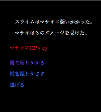 神殿内探索時に一部フロアでは、上記のようにザコ敵とのランダムエンカウントが起こります。確率は5%ですので、そんなに頻繁には戦闘は起こらない筈です。イベント戦闘の練習用だったり、むにゃむにゃ用だったりするので、もうちょっとエンカウント確率を上げてもいいかなーと思ったり。10%だと高過ぎる気がするので、8%ぐらいにしてもいいかも。