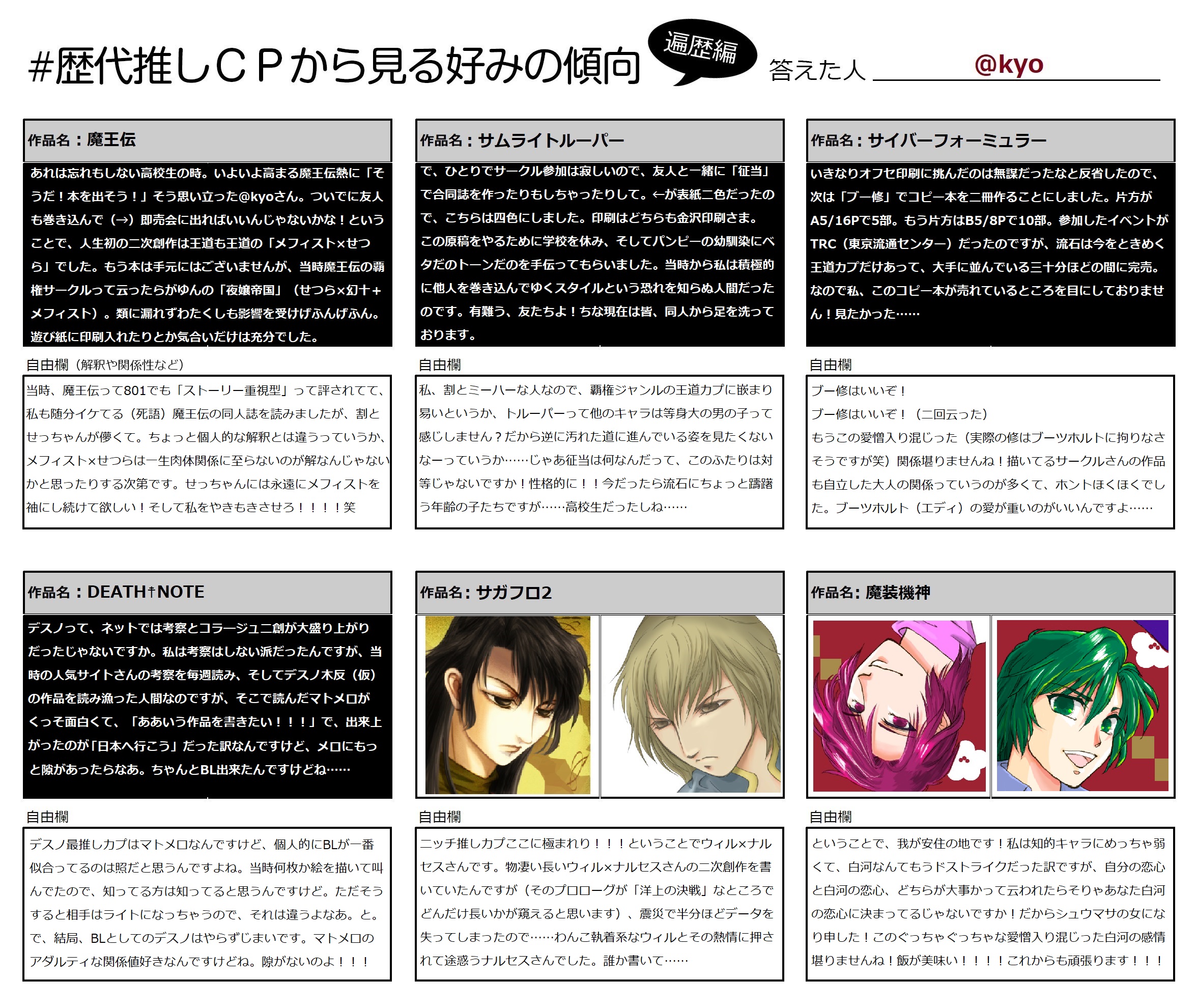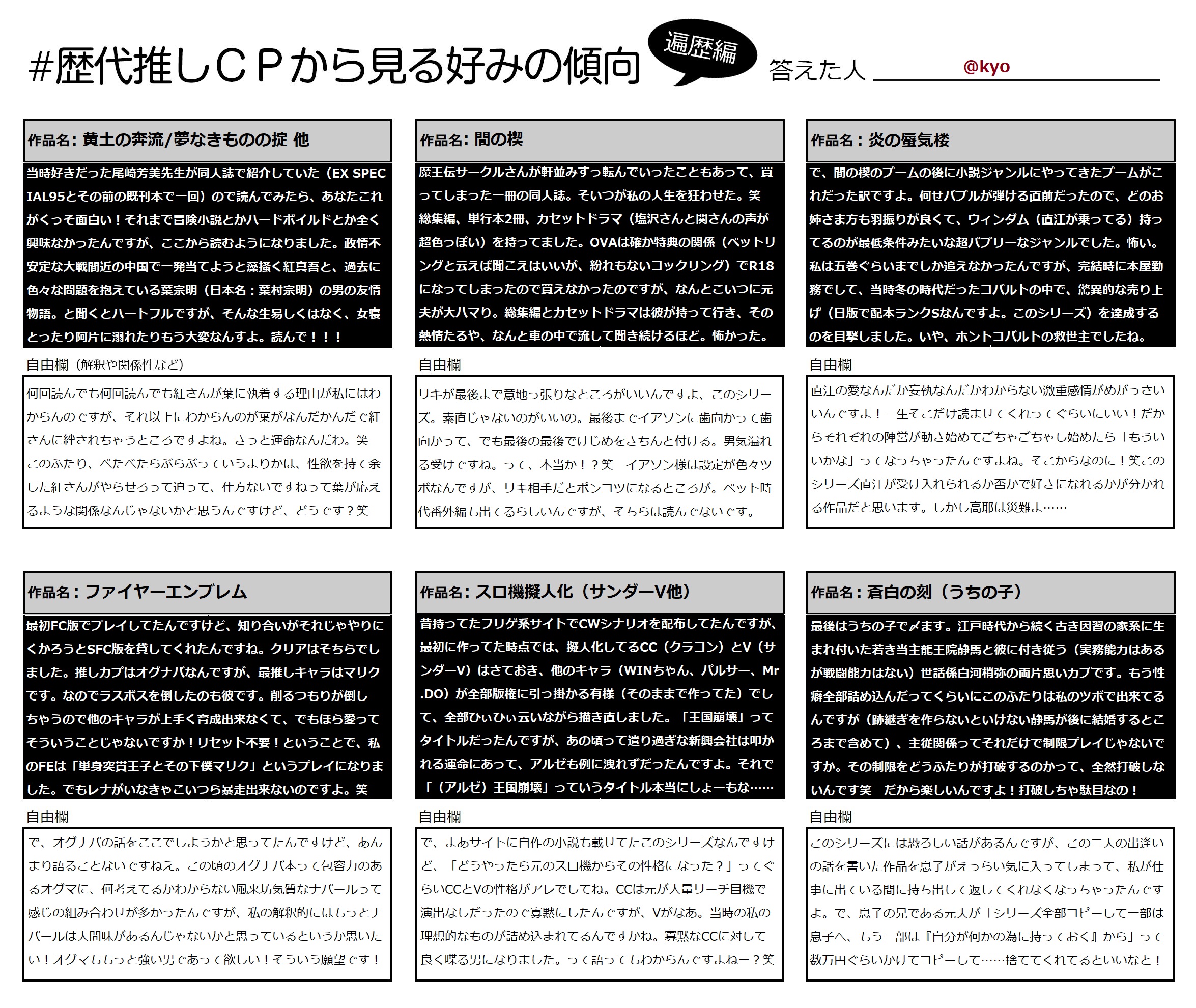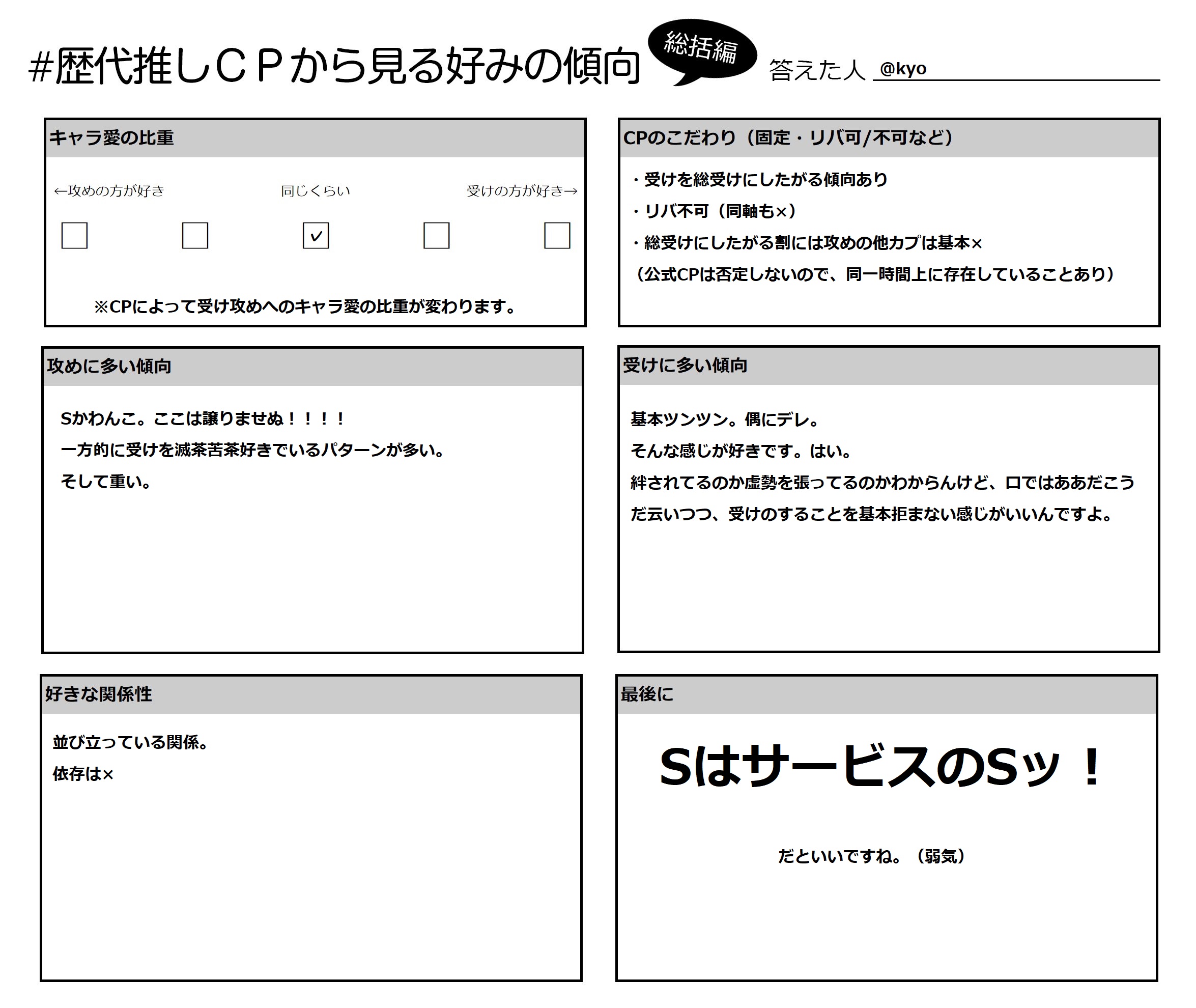 歴代推しCPから見る好みの傾向 お借りしてやってみました!X版より量を増やしました! オタク基本的に語りたがりですからね! こういうのは好きなんですよ! 以上にございます。お付き合い有難うございました!!! PR コメント