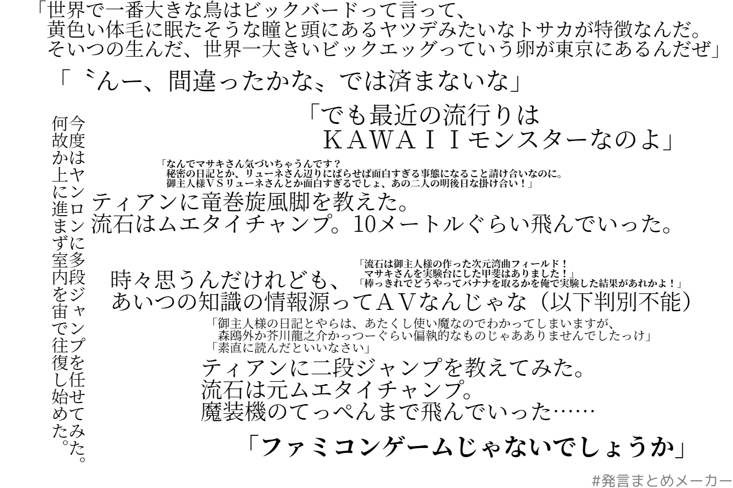 Twitterの方には「新しき年に幸いなる祝福を」の方を発言まとめメーカーで纏めたものを上げたのですが、その前に練習で「白い文庫~赤い新書」までの三作品の「私が個人的に名言だと思っている部分」を纏めていました。そこそこ面白く纏まった気がするので、こちらにうp。