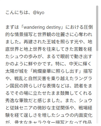 久しぶりにログインしてみたらNolaのシステムが変わったんですね。アシスタント機能が追加されていました。感想もより細かく書かれるようになっていて、気恥ずかしさを感じるやら、相変わらず私の癖は変わっていないんだなと指摘に思うやら……