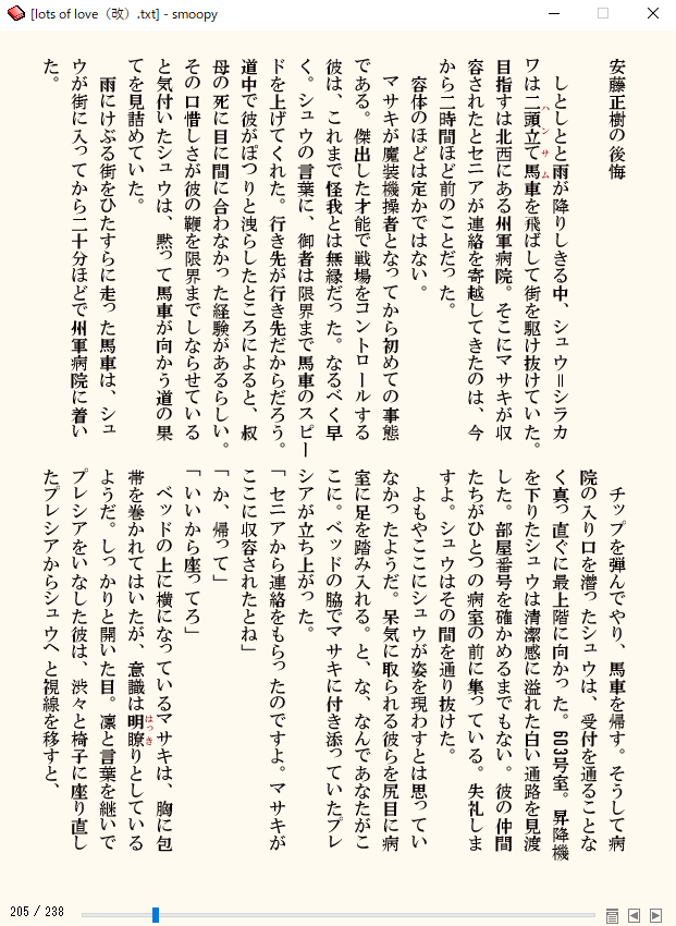 例えばこの物語のシュウマサはどういった関係なのか。どういった背景を抱えているのか。更に云えばどういった世界観なのか。二次創作である以上、まあお約束で端折れる部分もあるんですけど、私は設定に独自解釈をもりもり盛り込む人なので、そこを端折ると何を云っているかさっぱりわからない話が出来上がってしまいます。