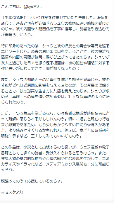 最後は「千年COMET」です。支部で私の予想を裏切ったブクマの付き方をしたので読ませてみました。さてさて、どんな感想が読めるのかなあ……