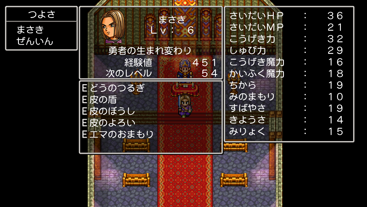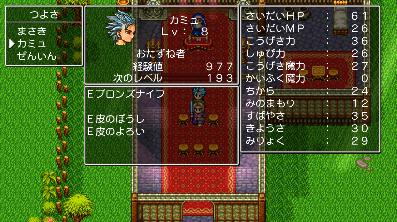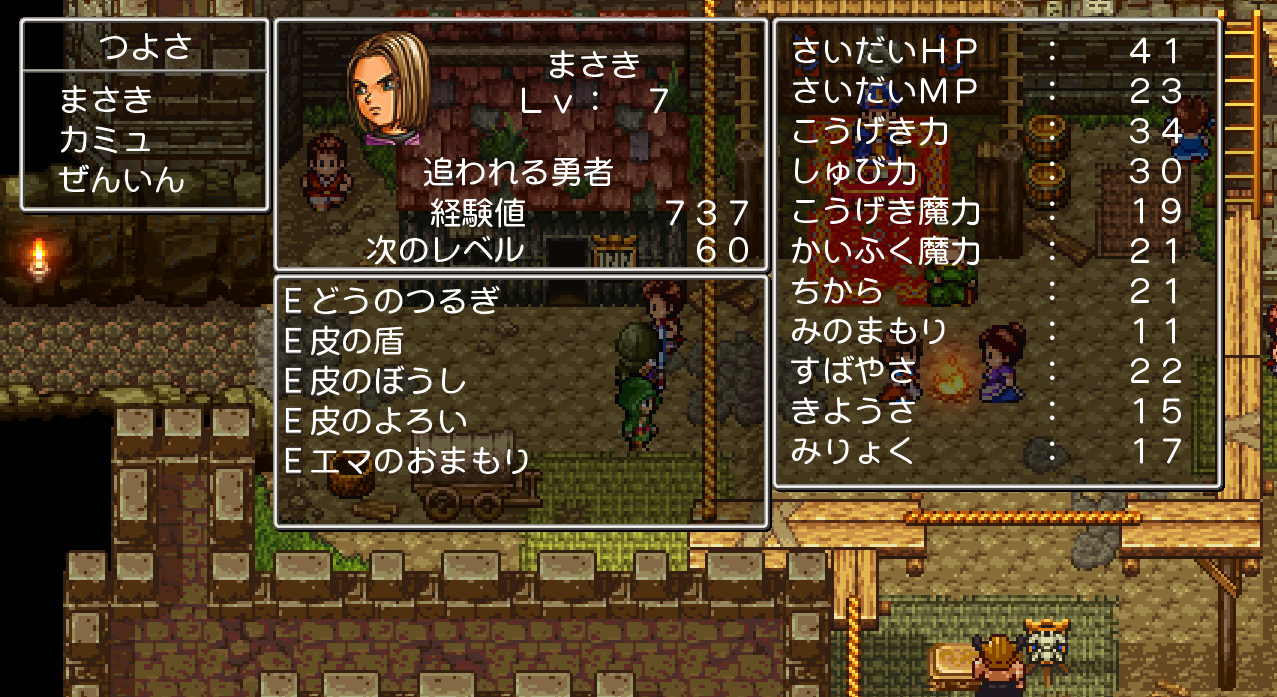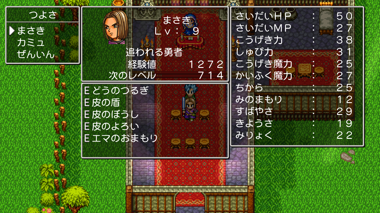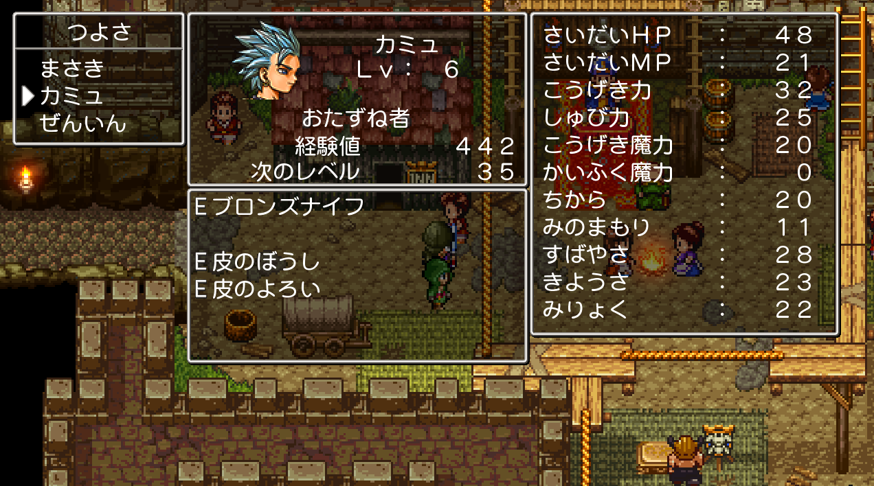 フィールドの敵に対してちょっとだけレベルが低く感じたので、ここからレベリング。2レベルほど上げました。DQシリーズは調子に乗ってストーリーを進めた挙句毒で身動きが取れなくなるということがままありますからね!上げられる時にレベルを上げておかないと!