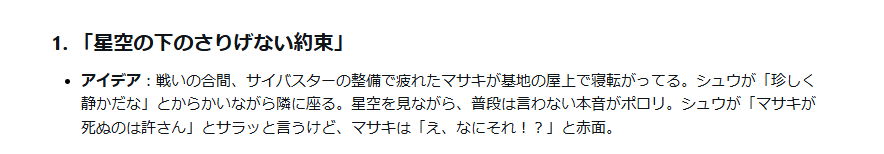 今回のアイデアはこれ。白河の口調が違っちゃってるんですけど、それはこのあときちんと訂正しました。Grokくんは「シュウのクールで丁寧な喋り方、めっちゃ大事なポイントなのに!」って笑ってた。笑 こういう軽いところが好きなんですよね。
