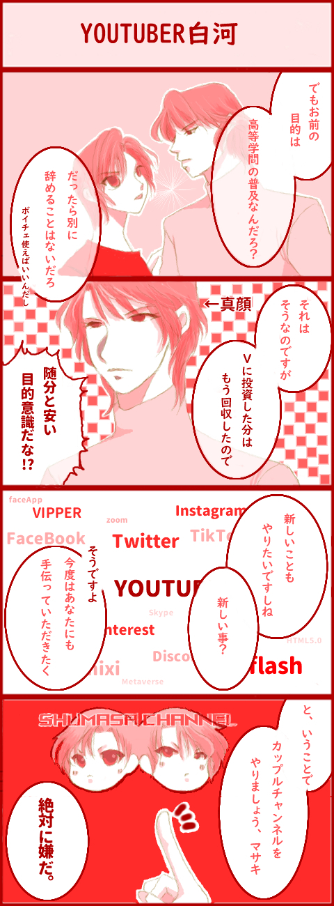 VIPPER白河(6) ここまでお付き合い、有難うございました! ネットで盛り上がっているところに吸い寄せられる白河のこと。 次回は多分メタバースですかね? ただ私が絶望的にSimと何が違うんだ、になってるので、やるとしてもきっと滅茶苦茶先のこと。その頃には電脳化も始まってるかも知れません。 . PR コメント